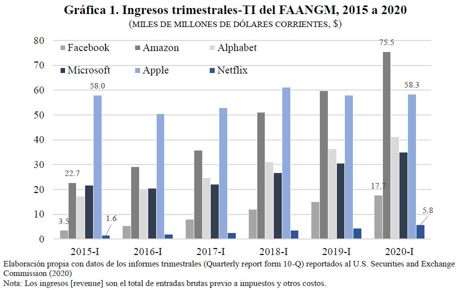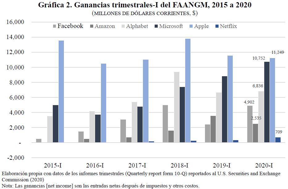 Al cierre del primer trimestre, meses de enero a marzo 2020, las FAANGM han experimentado resultados positivos tanto en sus ingresos como en sus ganancias (Gráfica 1 y 2). De ello podríamos deducir que tanto la pandemia como las políticas y medidas sanitarias adoptadas han aumentado el consumo destinado a los productos y servicios ofrecidos por estas corporaciones. En estos meses de “distanciamiento social” la diversa gama de dispositivos inteligentes, las telecomunicaciones y los distintos paquetes de programas y aplicaciones digitales han incrementado aceleradamente la vida virtual (The Economist, 2020b). Parte importante de las actividades laborales y académicas se están llevando a cabo de manera remota, al igual que la demanda en línea de diversos productos y servicios proveídos por las FAANGM (Kollewe, 2020).